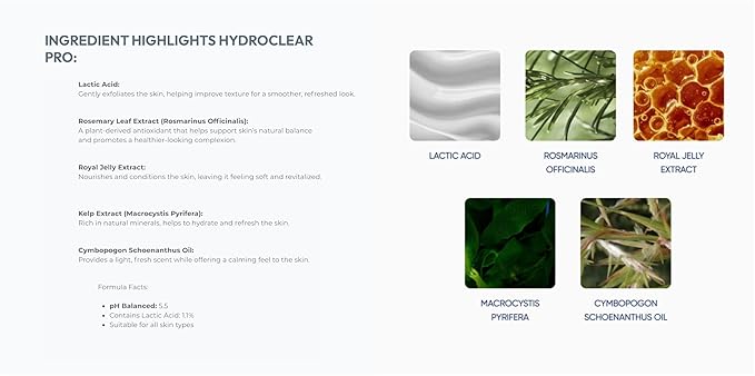 - π Smart Ingredient Blend β HydroClear Pro features lactic acid and glutamic acid to gently refine the look of skin texture and support a smoother appearance. Infused with rosemary and kelp extracts, this professional formula helps soothe, refresh, and balance the skin after treatments. Suitable for all skin types, it promotes a healthy, rejuvenated look.
