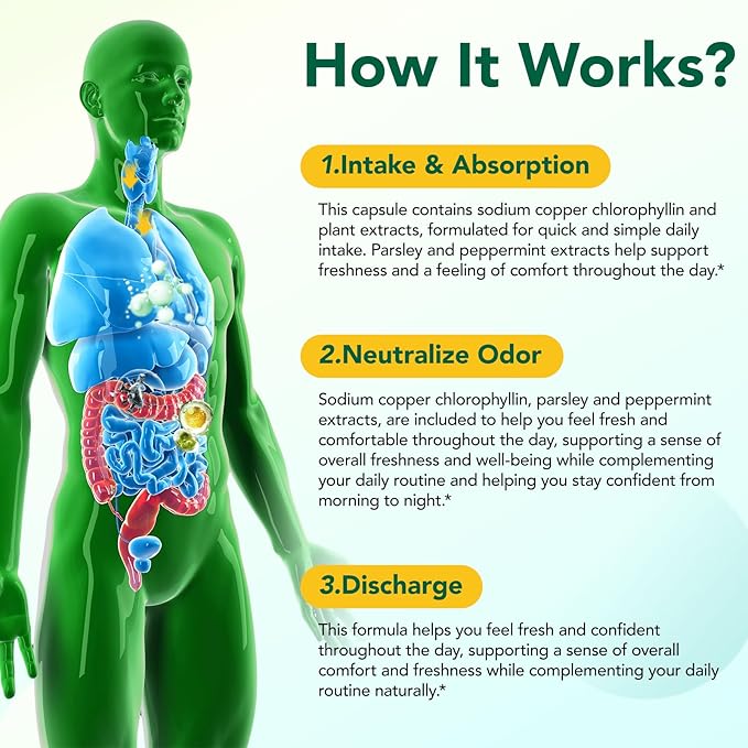 - 100% NATURAL TRIPLE GREEN POWER:Full body deodorant supplement with chlorophyllin 200mg, parsley leaf 300mg, peppermint 100mg to effectively target body odor, bad breath, and more. This potent formula helps neutralize odors from the inside out, keeping you feeling fresh and confident all day
