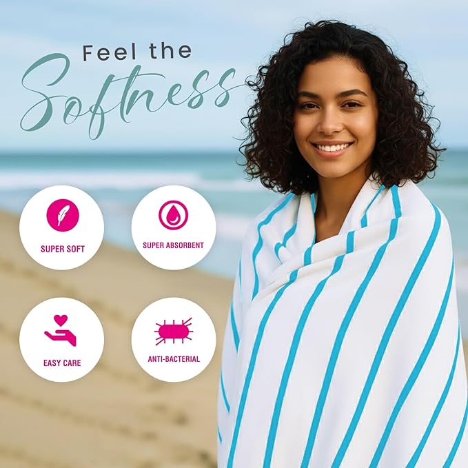 - Available in Four color, perfect for the whole family beach day this oversized beach towel offers ample space to wrap up in or lie down on.